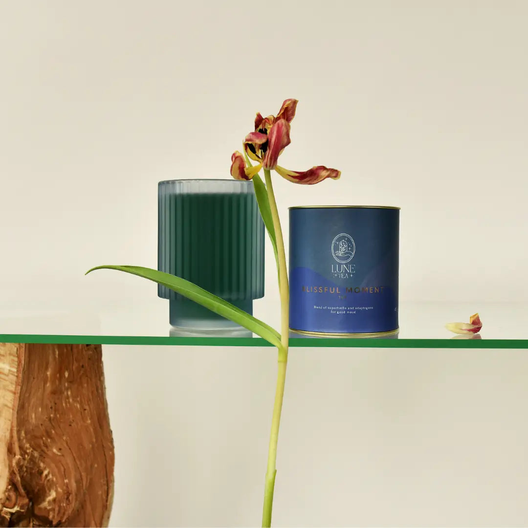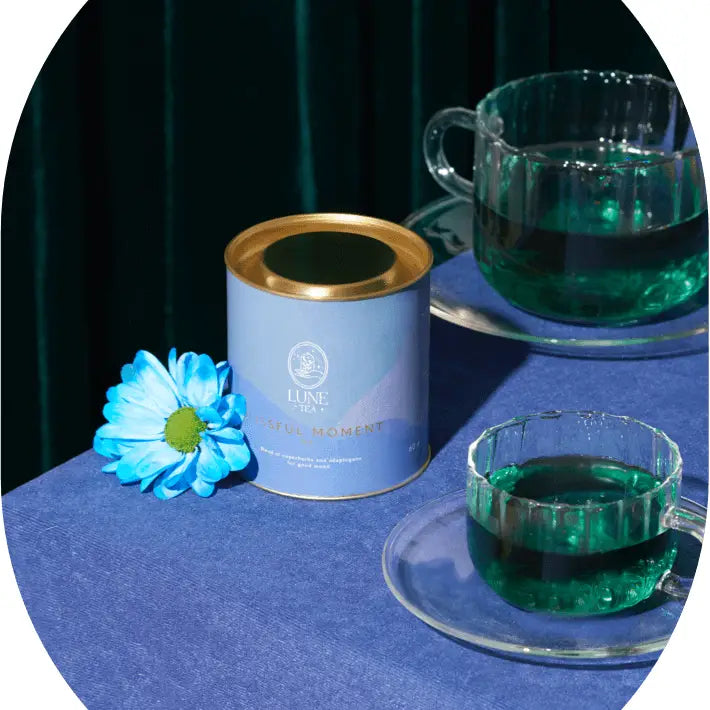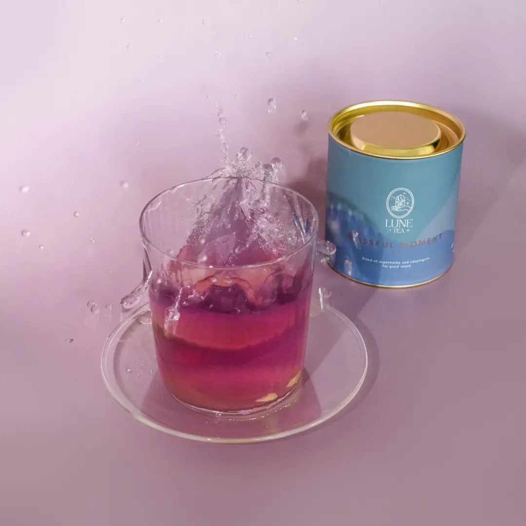 Blissful Moment är ett funktionellt te som förenar sensorisk skönhet med välbefinnande. Den turkosa infusionen skiftar dramatiskt till djup lila när citron tillsätts – en visuell upplevelse som speglar himlen efter regn. Formulerat med adaptogener och utvalda örter, stödjer detta te kroppens naturliga stresshantering och immunförsvar. Varje kopp erbjuder både estetisk njutning och funktionell nytta, vilket gör det till en meditativ paus i vardagen.
